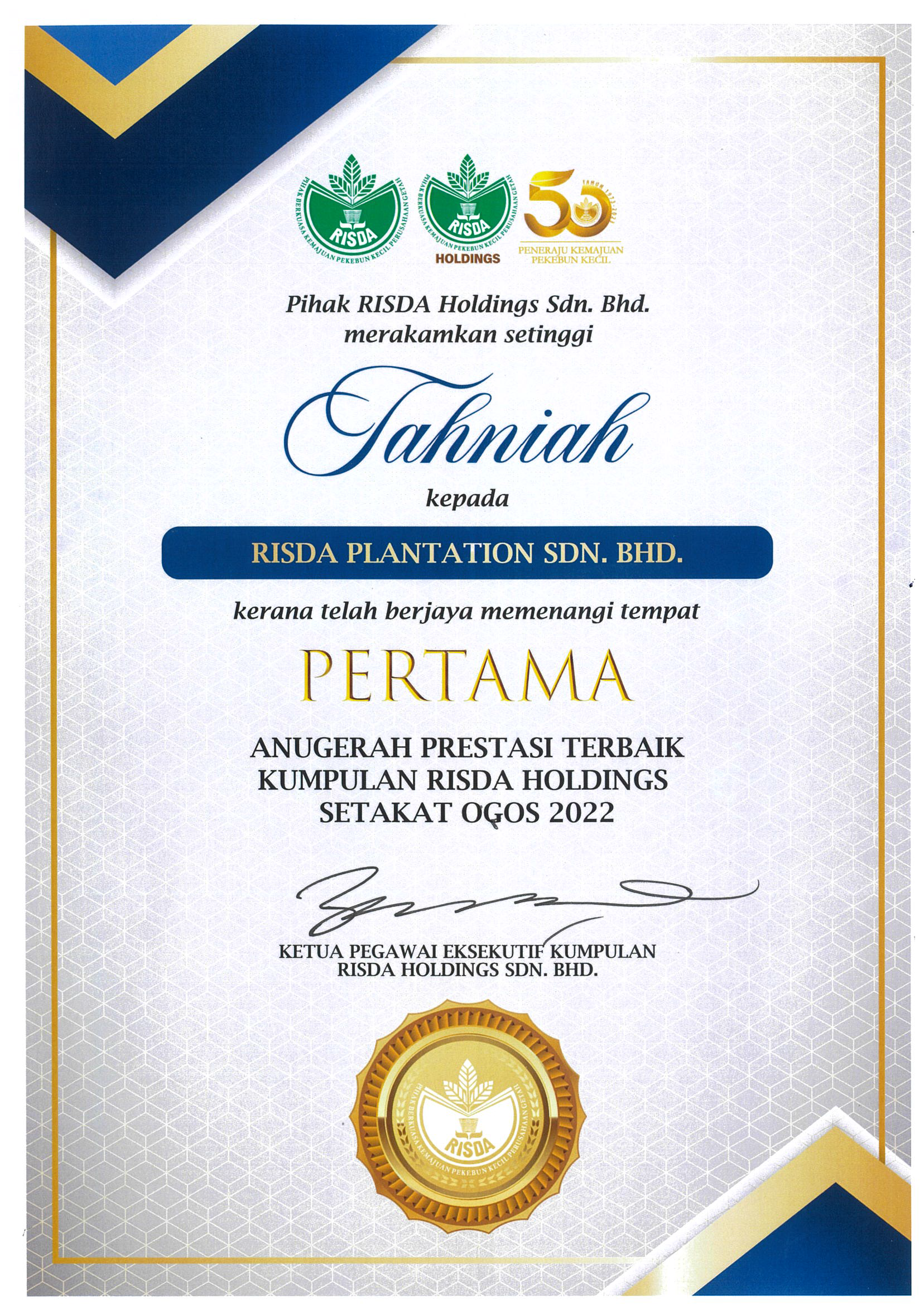 Tempat Pertama - Anugerah Prestasi Terbaik Kumpulan RISDA Holdings setakat Ogos 2022